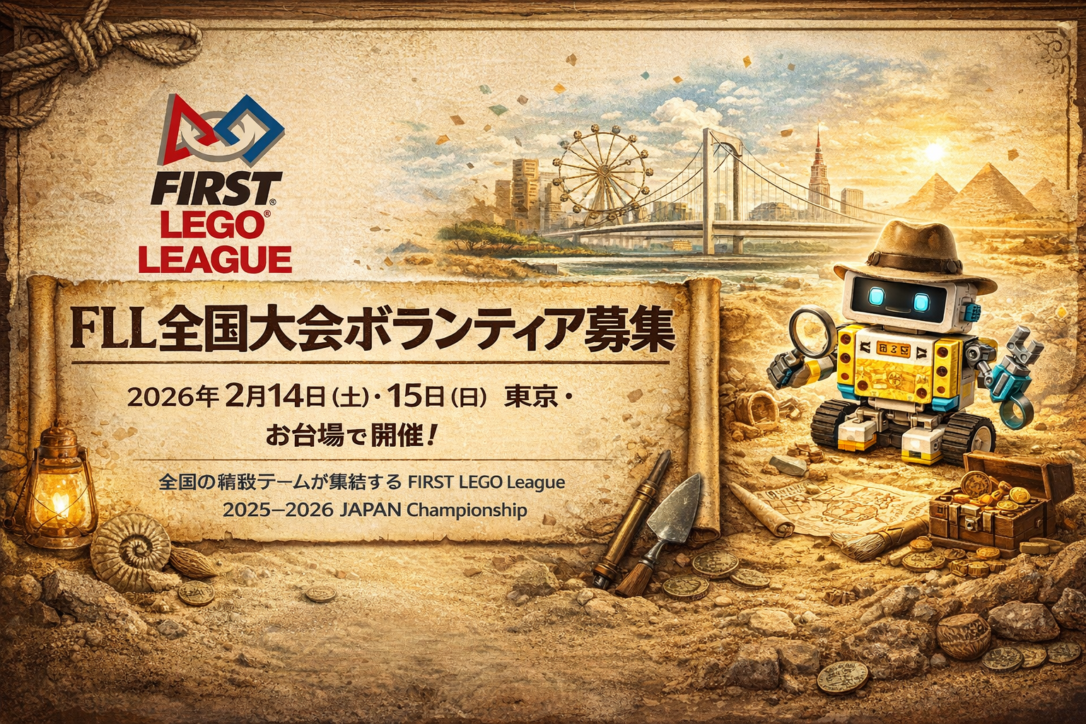 2026年2月14日(土)・15日(日)、FLL2025-2026の全国大会が、東京・お台場で開催されます。各地域の予選を勝ち抜いたチームが参加する、日本最高峰のFLL大会です。FLL事務局では、本大会の運営を支えてくだ […] …続きを読む